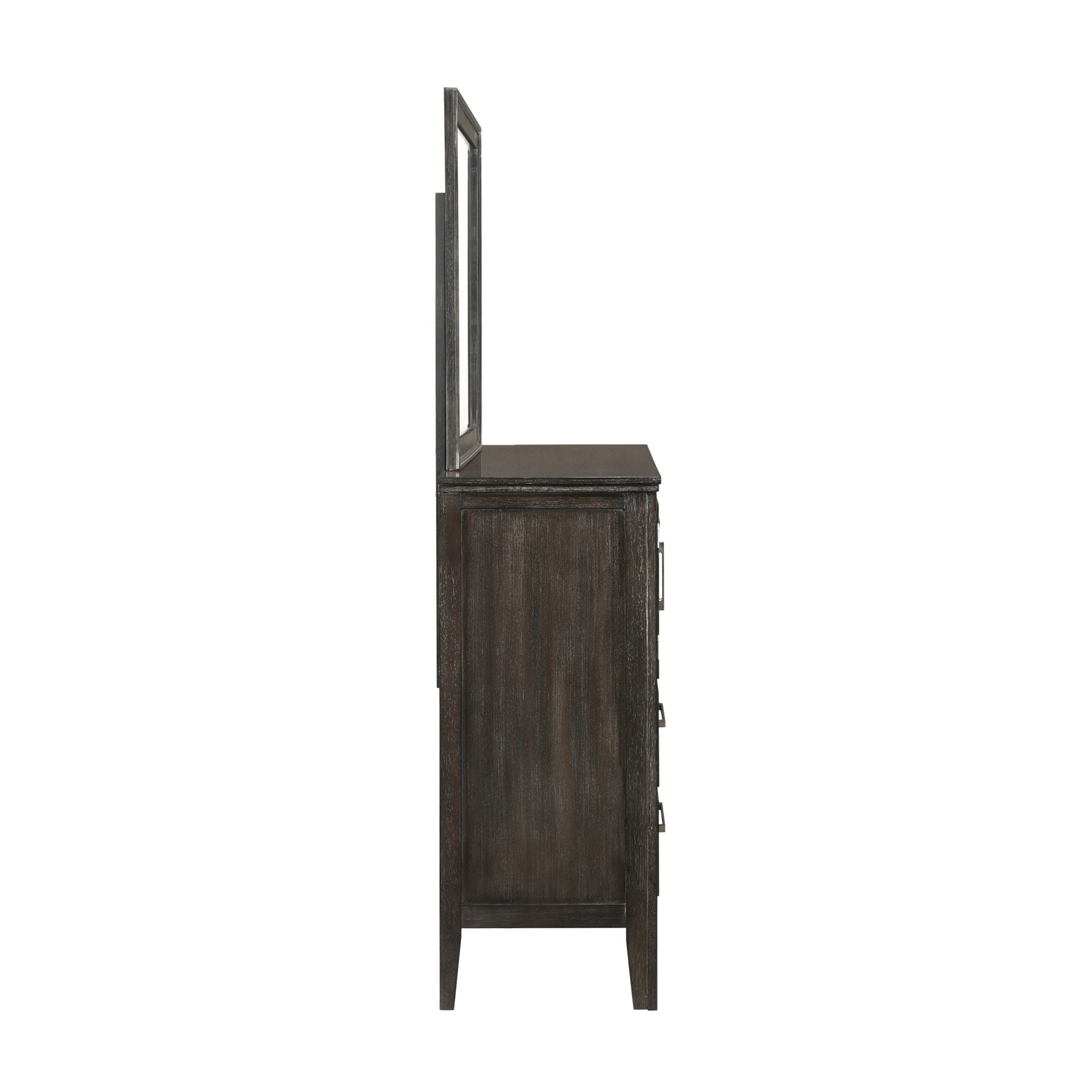 The Andover Dresser Mirror is a perfect complement to any bedroom, combining durability, style, and functionality. Expertly crafted from solid Rubberwood, manufactured woods, and wood veneers, this mirror is built to last while showcasing the natural beauty of real wood. The rich finish is achieved through a meticulous multi-step process, including sand-throughs and white glazing, which imparts a weathered yet sophisticated appeal, highlighting the unique grains and characteristics of the wood. The pristine, low-distortion beveled glass is beautifully encased in picture frame-style moldings, offering a clean and refined look that enhances any space with timeless elegance. This mirror not only serves a practical purpose but also adds a touch of sophistication to your bedroom decor.