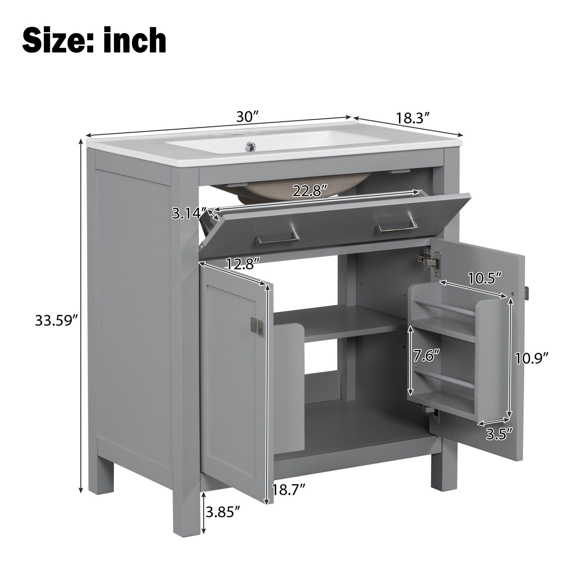 - Versatile Storage: Features a flip-out drawer, two cabinet doors with storage racks, and a height-adjustable U-shaped shelf that provides ample storage without interfering with plumbing.