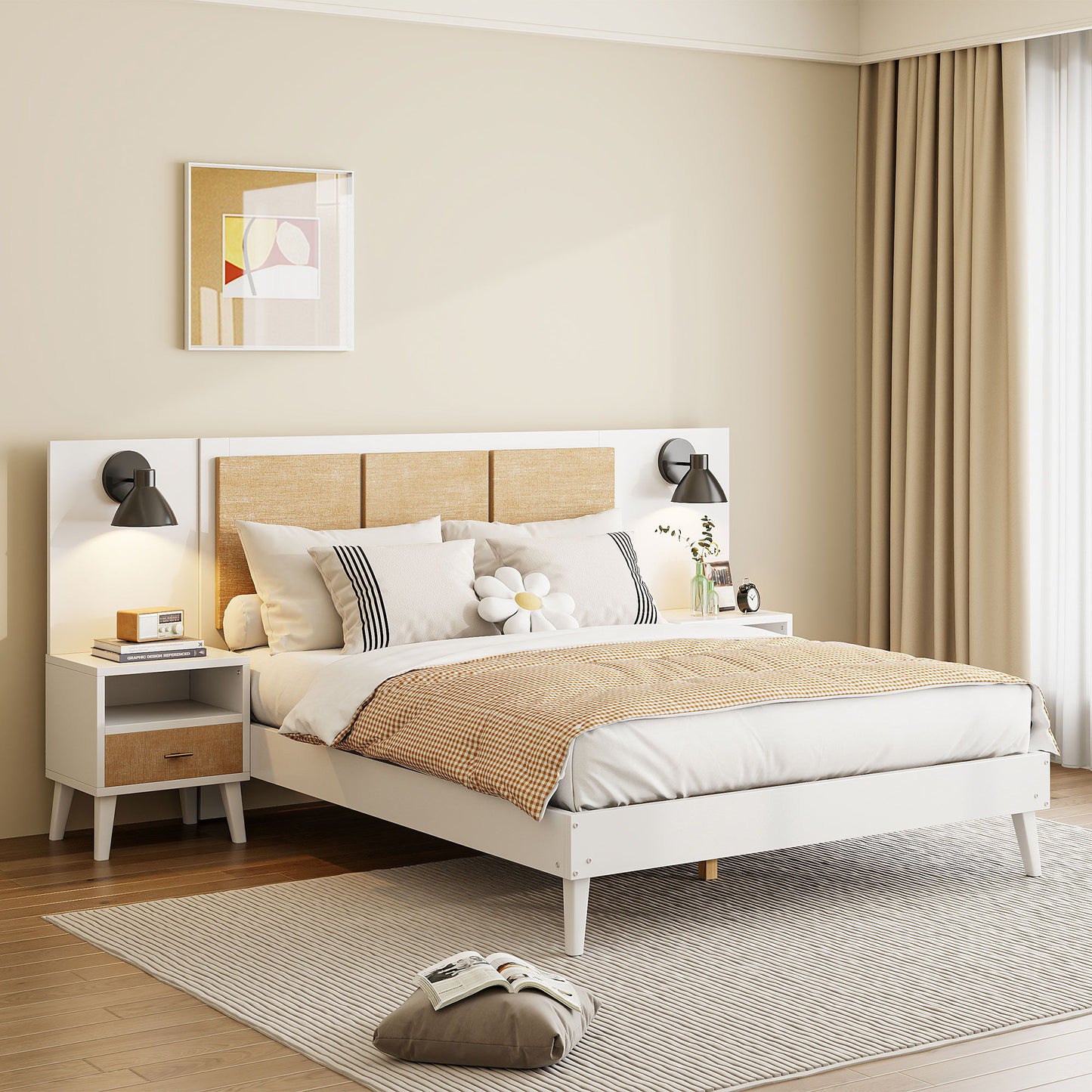 Elevate your bedroom with this elegant Solid Wood Bed Frame with Nightstands. Designed for durability, the high-quality solid wood construction ensures a sturdy and stable bed that will last for years, providing you with the comfort you deserve. The thoughtfully designed nightstands on each side come with large drawers, offering convenient storage for your essentials and helping you keep your space tidy.In addition to functionality, this bed features built-in lamps in the headboard, providing essential lighting while adding a stylish touch to your decor. The combination of rattan and wood creates a beautiful aesthetic that fits seamlessly into various decor styles, from modern to rustic.