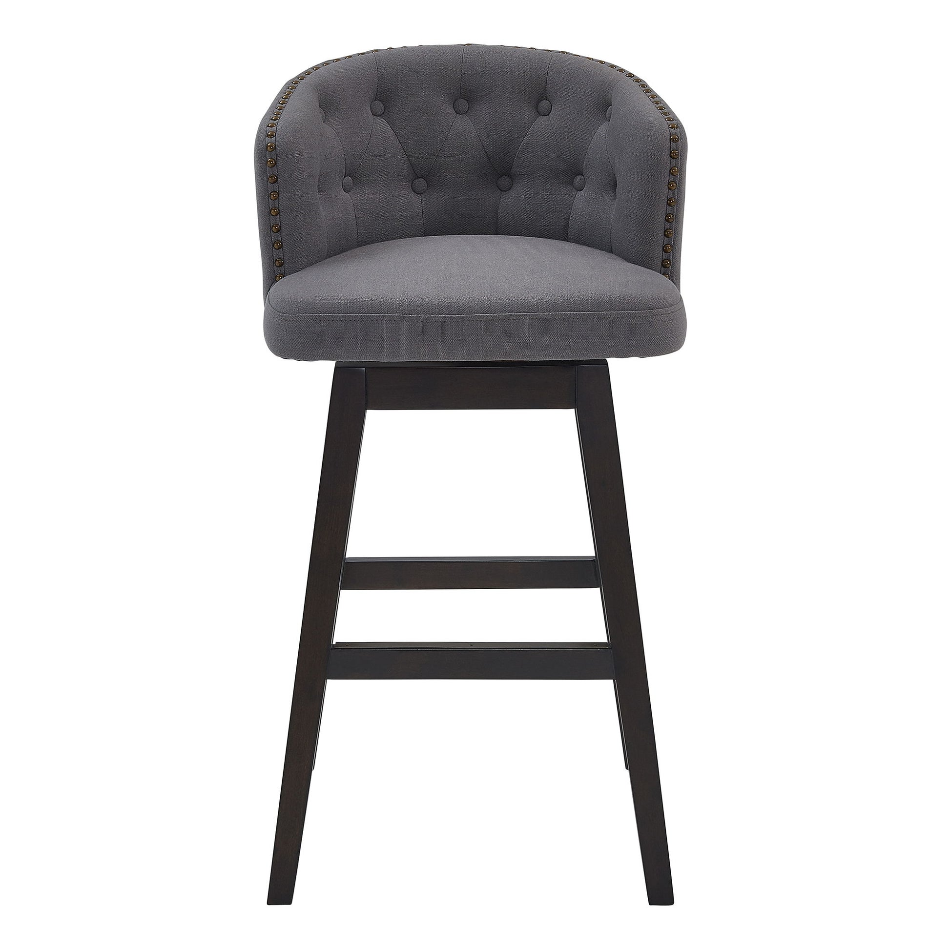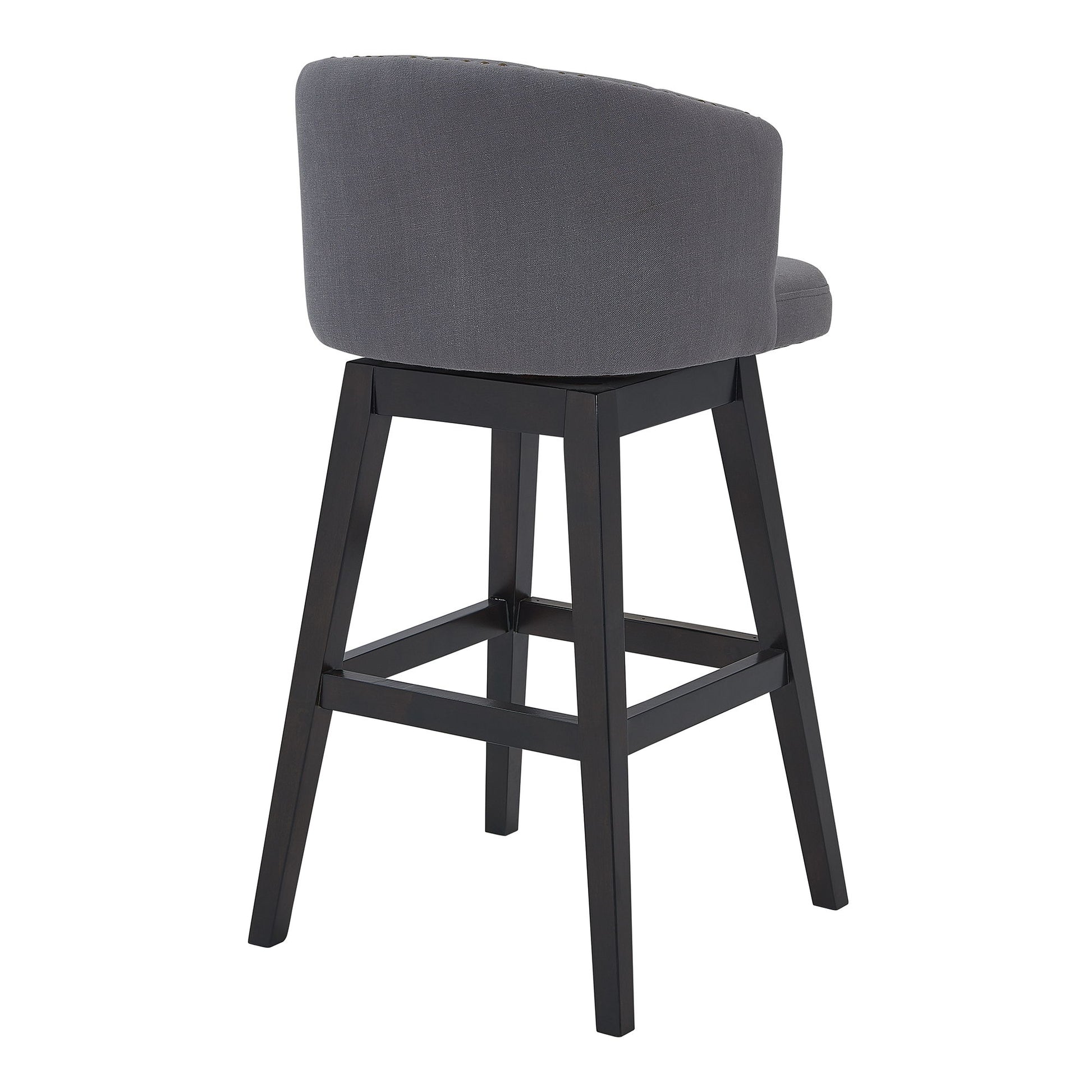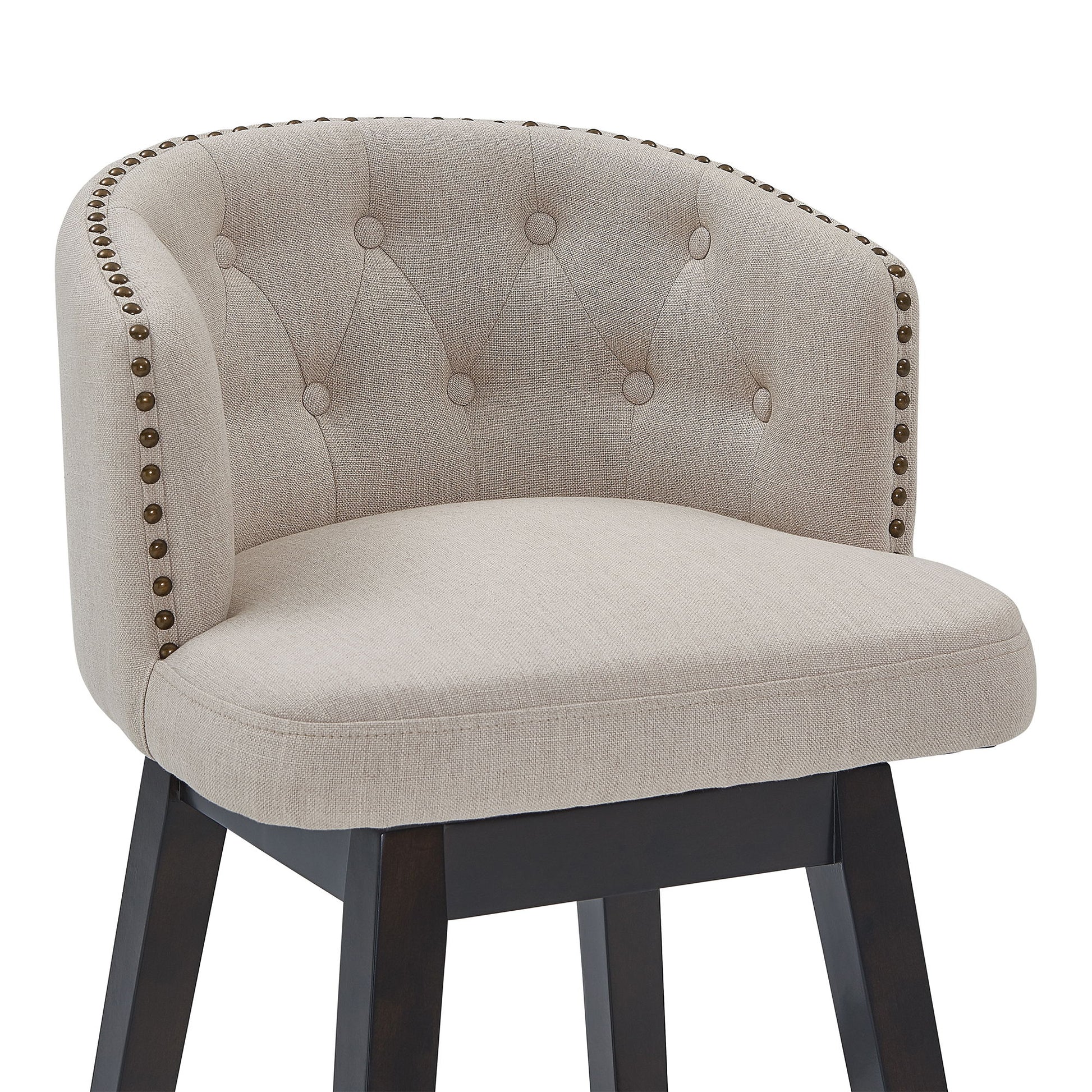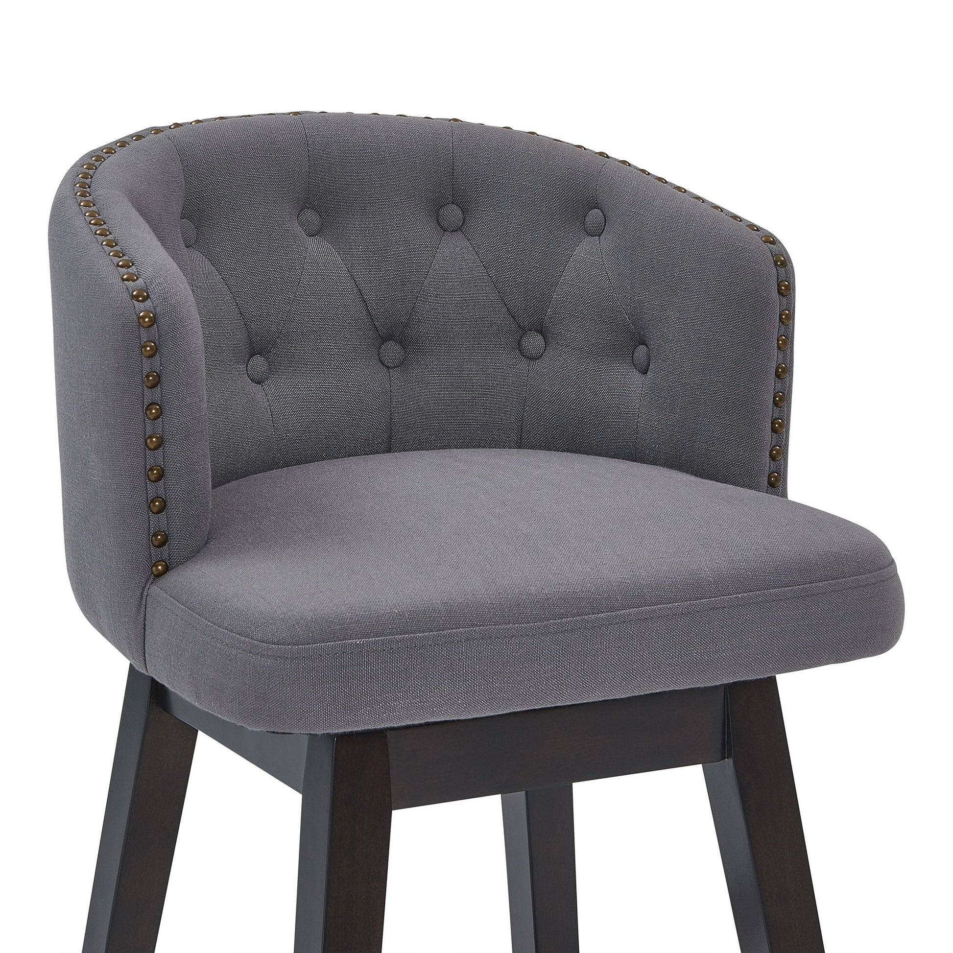 Timeless style is at your fingertips with the Armen Living Celine Swivel Wood Bar Stool. The rounded back features high-end diamond tuft stitching and nail head accents as well as ergonomic properties to keep your back healthy and properly aligned. The 360-degree swivel provides optimal mobility and allows you to easily engage with your friends or family regardless of their place in the room. The Celine's legs are tipped with floor protectors, assuring that the barstool will not damage floors when moved, making this a great addition to any room! Pull the Celine up to your kitchen island, peninsula counter, or home bar to create a warm atmosphere. The wooden frame features a finish that easily incorporates to any home regardless of style theme and the elegant silhouette makes for a beautiful conversation piece that will liven up any party or gathering.
