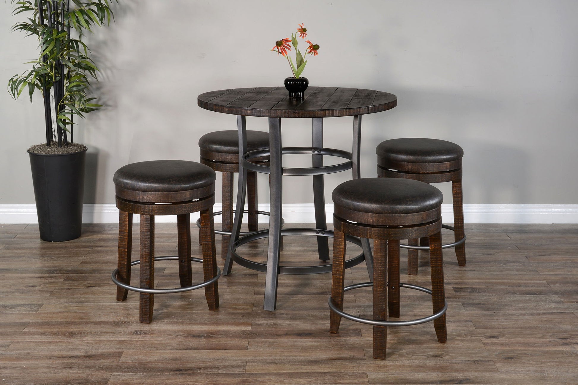 Elevate your small space with the addition of our Metroflex counter height table—an outstanding choice for compact areas. Crafted from durable mahogany solids and veneers, this table is not only stylish but also built to last. The powder-coated metal ensures long-lasting durability, making it a resilient and attractive centerpiece for your space. Discover the perfect blend of functionality and style with the Metroflex counter height table, designed to enhance any limited space with a touch of sophistication.