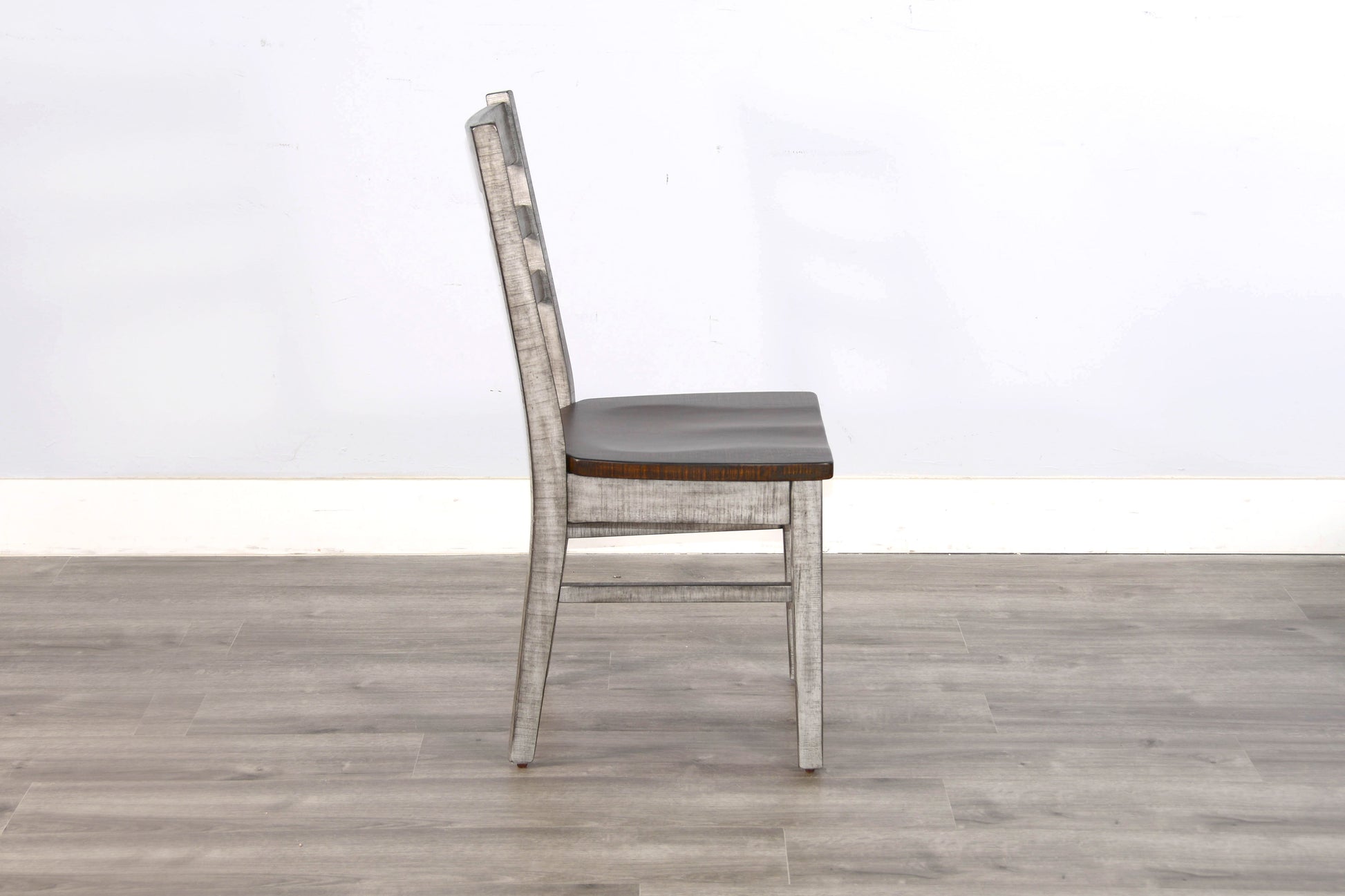 This Homestead Hills ladder-back chair with wood seat was sturdily built to last and finished in a beautiful two tone finish.