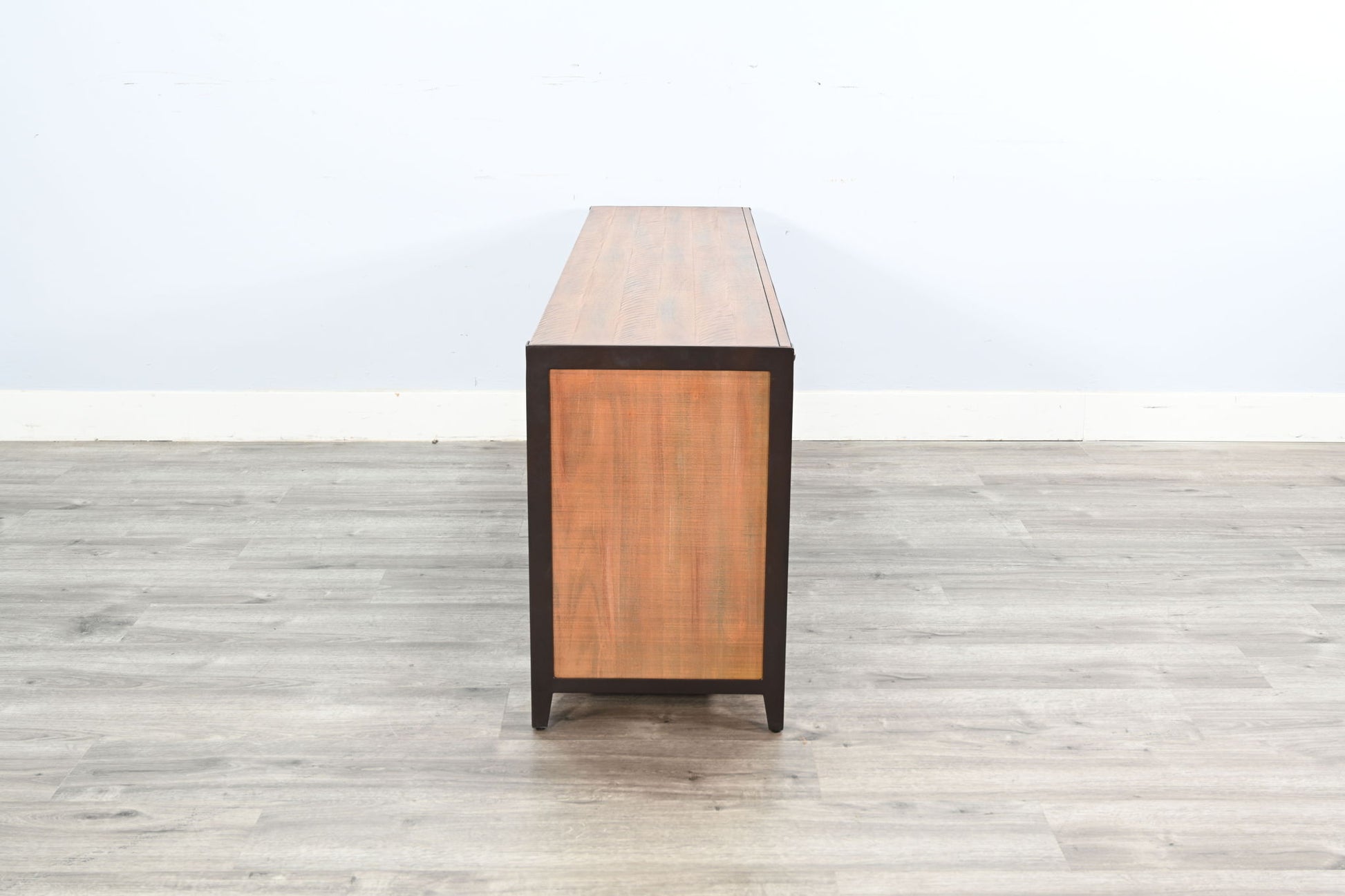 Bring industrial style and functionality to your space with this versatile media console. Featuring a sturdy wood and metal construction, it offers open shelving with ample storage for electronics, decor, or entertainment essentials. The sleek design includes a riveted metal trim for added character and durability. Ideal for living rooms, media rooms, or open-concept spaces, this console seamlessly blends modern industrial charm with practical organization.