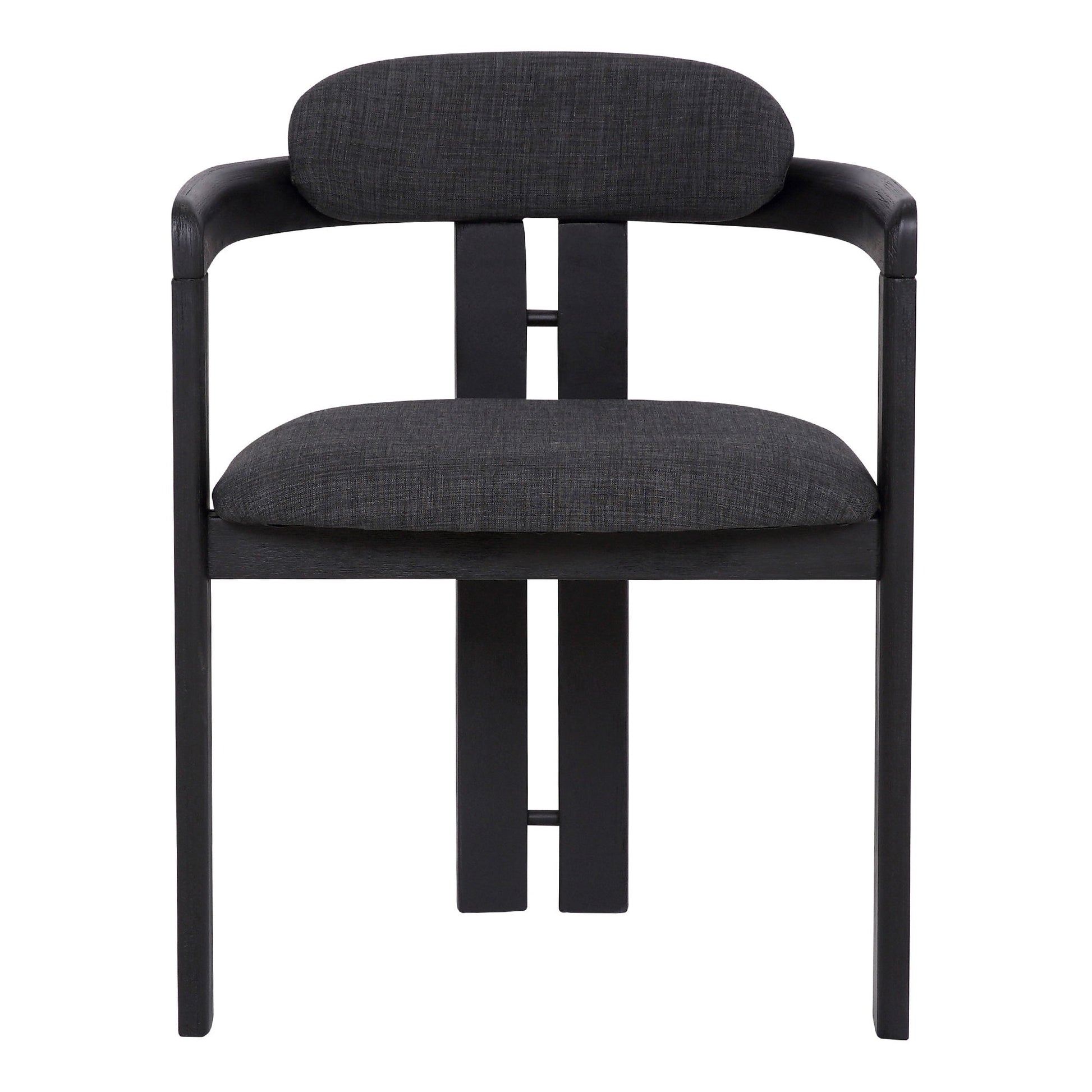 The Armen Living Jazmin contemporary dining chair features a unique frame design that is guaranteed to enhance the beauty of your modern household. The Jazmin's impressive wooden frame features a 3 leg base design and tall arms which serve as stylish contemporary accents. The chair's modern Charcoal Fabric upholstery is stuffed with concentrated foam which provides excellent seat and back padding. Though a wonderful choice for the dining or living room, the Jazmin's versatile design allows it to function well as additional seating in just about any room of the house. The stylish Jazmine chair is available in your choice of either a Black Brush or Walnut wood finished frame.