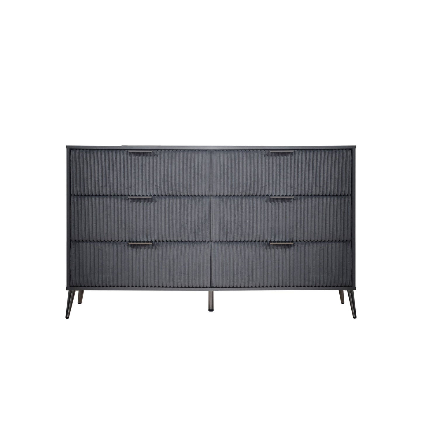 The Kailani 6 Drawer Dresser combines modern minimalist design with durable, eco-friendly construction, making it a stylish and sustainable choice for any bedroom. Crafted from solid rubberwood, engineered wood, and eco-friendly decorative laminate, this dresser is built to last with resistance to scratches, moisture, and stains, ensuring long-term beauty with minimal upkeep. The dresser features clean lines, a sleek silhouette, and a chic ribbed texture, complemented by slim metallic handles and tapered legs that enhance its contemporary appeal. Wrapped in luxurious 100% Polyester Velvet, the textured drawers are accented by chrome pulls and glide effortlessly on full-extension slides, with dovetail joinery providing lasting strength and smooth operation. This dresser not only adds a touch of sophisticated glamour to your space but also offers practical, snag-free storage, making it a perfect blend of form and function.