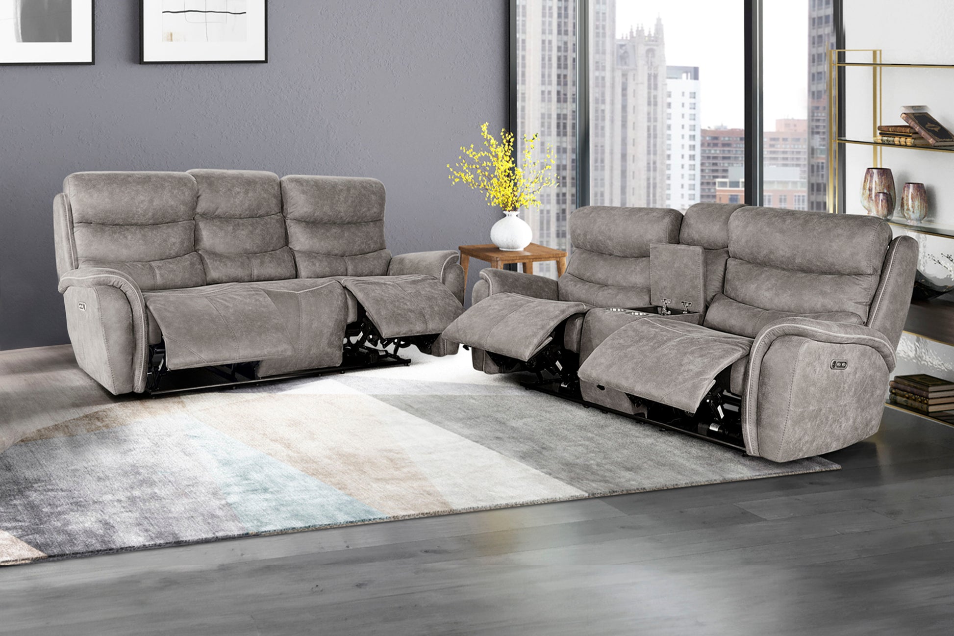 Indulge in the luxurious comfort of the Kamari Reclining Sofa Set. Crafted with a sumptuously soft dappled gray upholstery, this set invites you to sink into relaxation. Tailored to perfection, its triple roll backs, bucket seats, and wrap-around arms exude sophisticated style, accentuated by tasteful contrasting welt detailing. Recline and unwind with fully upholstered chaise recliner footrests, offering unparalleled comfort. Built for lasting support, hardwood and manufactured wood frames, coil spring cushions, and resilient foam ensure durability and coziness for years to come. Convenience meets style with the loveseat''s center console for remote storage and built-in cupholders for your beverages. Versatile in design, whether your taste leans contemporary or traditional, this set effortlessly complements any decor.