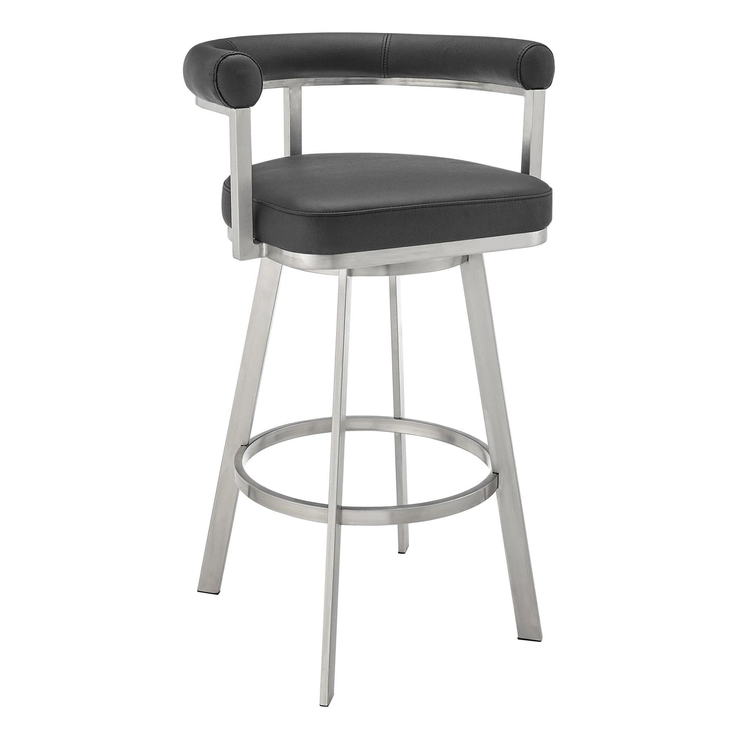 Glam up your space with the flair of our Magnolia swivel bar or counter stool in faux leather and metal from Armen Living. Featuring a minimal and streamlined barrel back, our mid-century modern counter stool vouches for a sleek and inviting look. The plush cushioning at the back and the padded seat offers a comfortable seat while the open back allows for breathability. Uplifted with a chic metal frame, our stylish counter or barstool makes a powerful design statement. Upholstered in faux leather, it provides a comfortable stay at a high dining area, kitchen counter, or worktable. Faux leather does not crack easily and is stain resistant, does not fade easily and is also UV resistant. Counter or bar height stools that feature a swivel mechanism tend to be much more convenient for everyday use or when entertaining. The wonderful full 360-degree swivel function allows for maximum mobility. The smooth glide swivel function allows you to change directions with ease, making this your new favorite seat in your home.