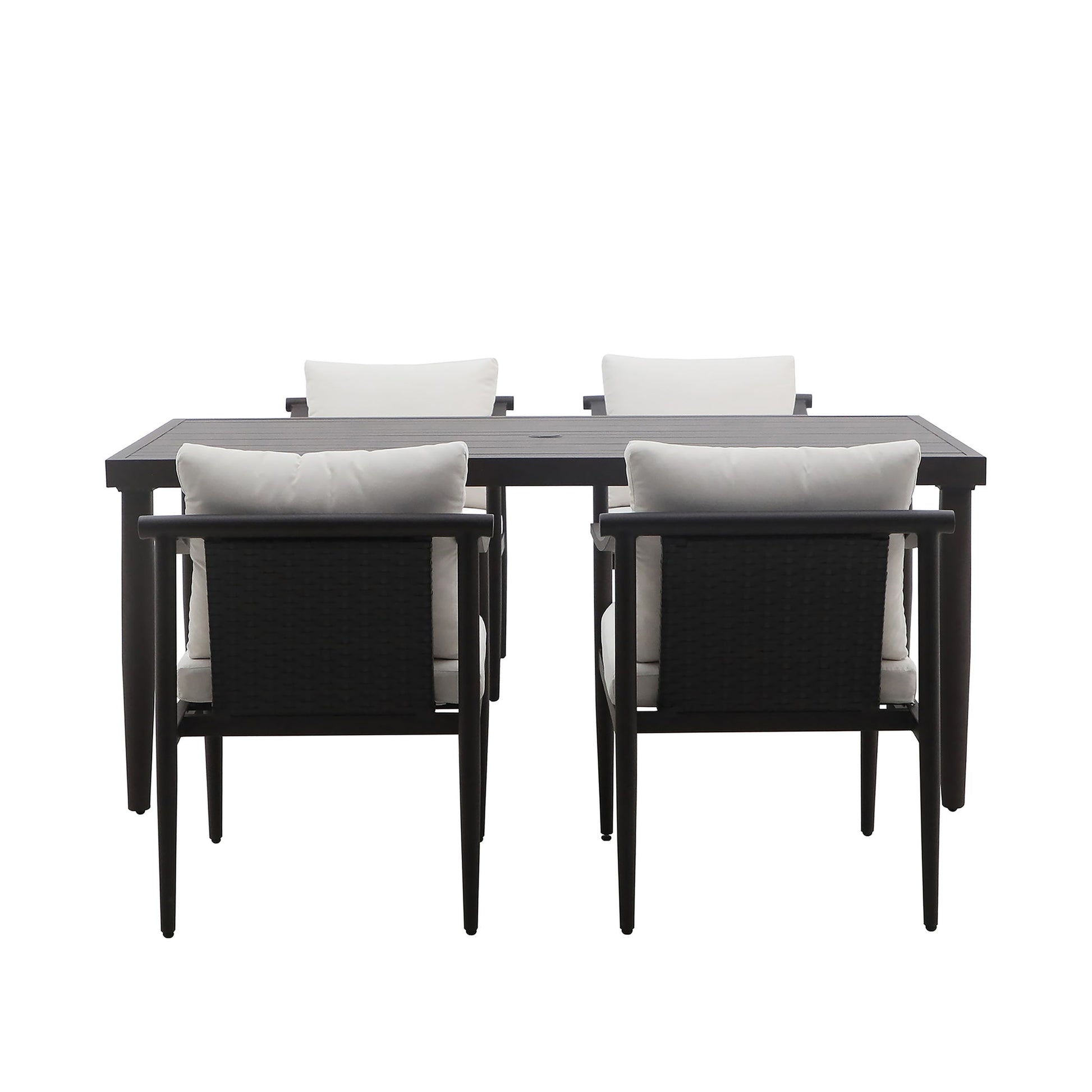 Experience outdoor dining in style with the Moana Outdoor Patio Dining Set, featuring a durable table and side chairs with comfortable blue cushions. The aluminum frames boast a baked-on powder coat finish, providing a strong foundation that resists scratches and enhances longevity. The table''s classic slatted top not only adds aesthetic appeal but also aids in water drainage, making it practical for any weather. Crafted from high-density PE wicker, the set offers the timeless look of wicker with the modern benefits of being low-maintenance, colorfast, and resistant to water, mildew, and fading. The chairs come with cushions made from our exclusive Sunduraâ„¢ fabric, a solution-dyed 100% polyester that resists fading, mildew, and moisture, ensuring vibrant color season after season. High-density 6cm foam cushions provide comfortable seating, and with a generous 72-inch length, the table accommodates up to eight people, perfect for family dinners or outdoor gatherings. The minimalist design with clean lines and a sleek dark frame allows this dining set to seamlessly blend into various outdoor settings, offering a stylish and understated look for contemporary spaces.