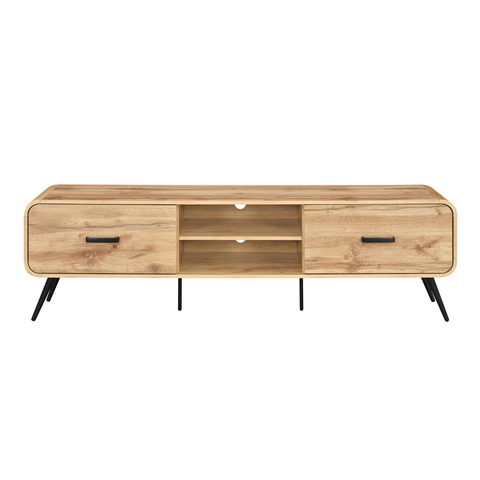 The Rowan 71" TV Console combines mid-century style with functional design. Its low profile supports larger TVs while maintaining a sleek look. Made from eco-friendly wood in a warm oak finish, it features rounded edges, black hardware, and tapered legs. Two drawers and open center shelves offer organized storage for media and accessories—perfect for modern entertainment spaces.