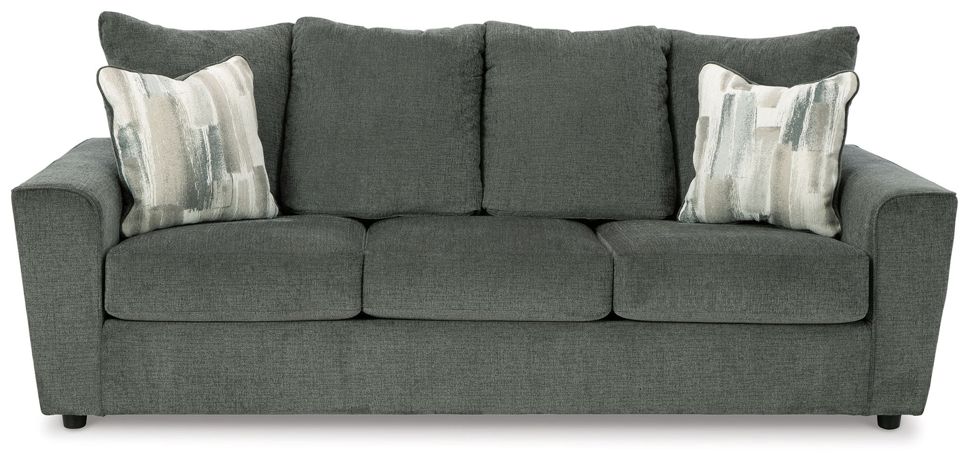 What’s new in neutrals? Shades of gray, of course. Embrace the sophisticated design trend with this gorgeous sofa that offers a clean-lined, contemporary style at a comfortably cool price. Sure to lift your spirits, the plush chenille fabric is fabulously neutral. Contemporary flared arms give it a distinctive flair. This sofa also arrives with two cool brushstroke accent pillows to elevate the taste and comfort level.