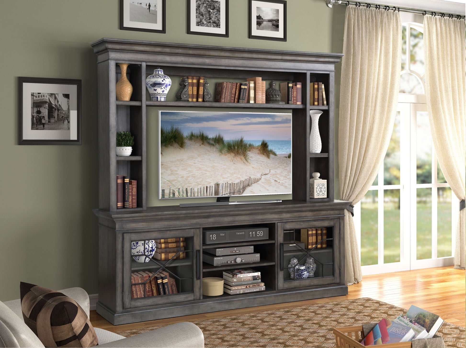 With a touch of rustic charm, this Console with Hutch from the Sundance collection creates an impressive focal point. Perfectly sized for televisions up to 92 inches, it offers storage, display and thoughtful functionality. Its handsome hand-applied, multi-step Sandstone finish complements any room's décor while conveying unique character. Energy-efficient LED lighting with a three-way touch dimmer button highlights the treasures and collectibles you display. Two glass doors with decorative insets provide room for storage and display while three open center shelves are ideal for components. Inspired by the beauty of the great outdoors, it offers a distinctive look that's stunning from every angle.