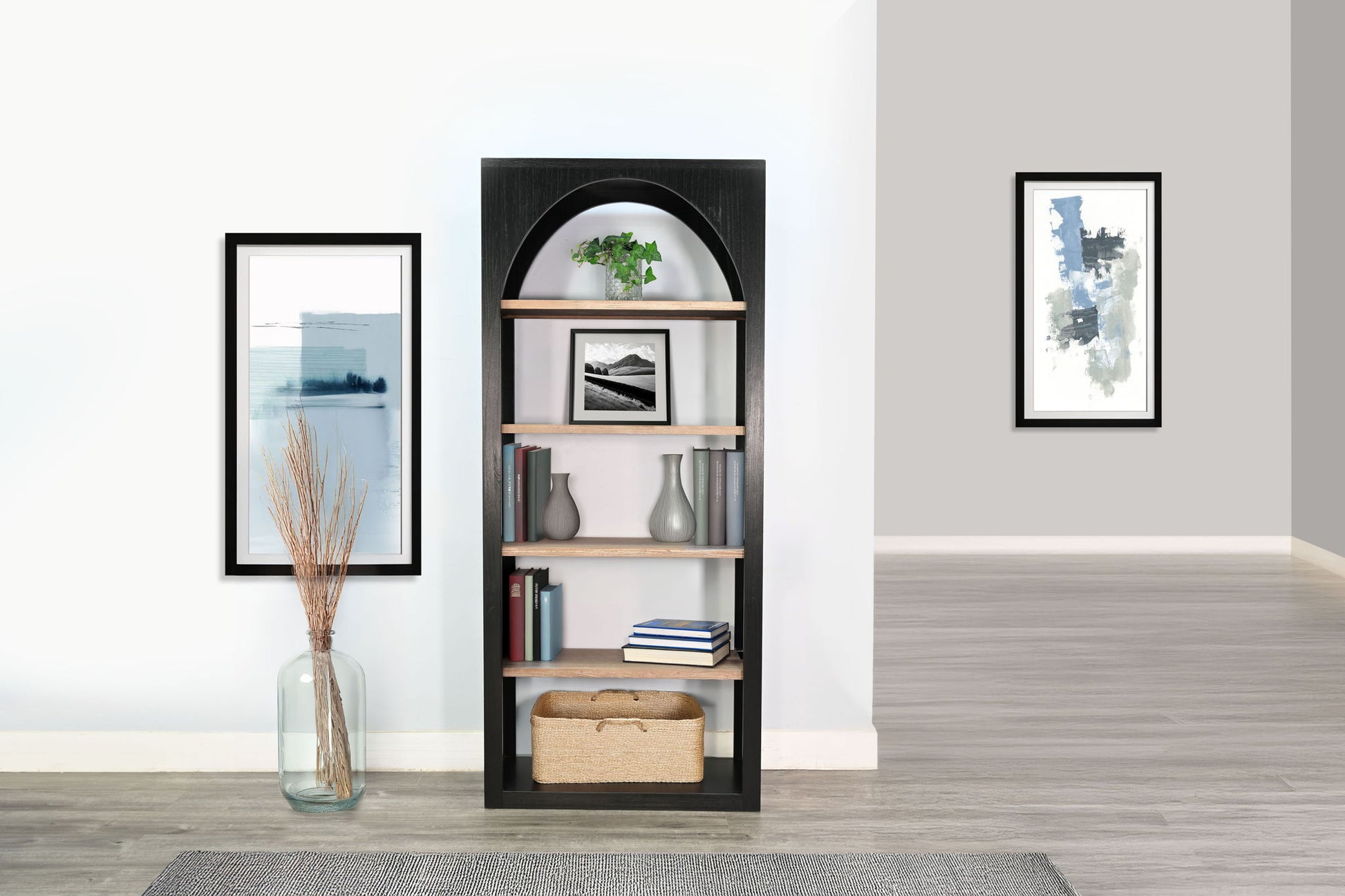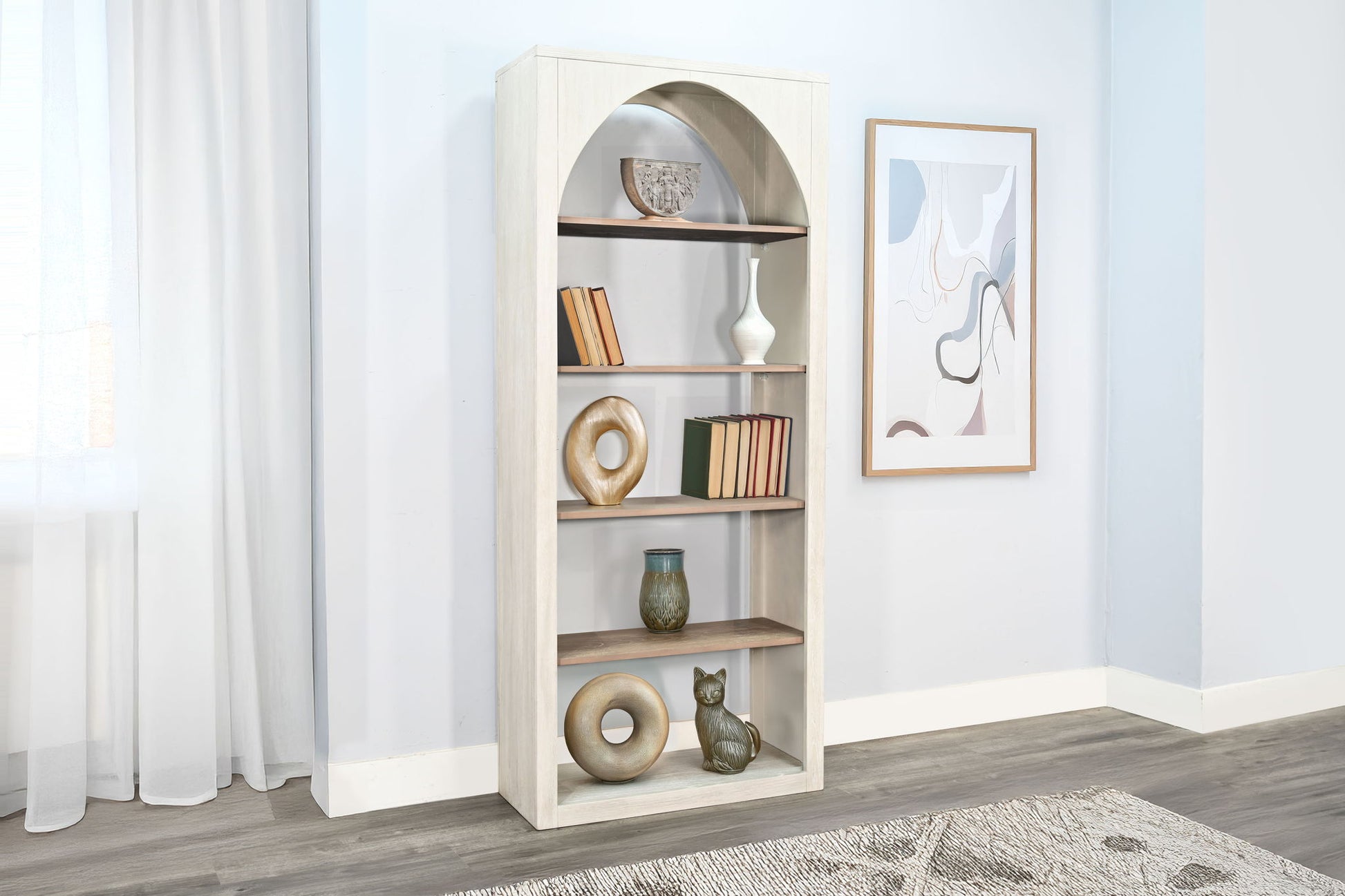 Bring sculptural elegance to your storage with this arched frame bookshelf. The graceful silhouette is complemented by five open shelves that offer a perfect canvas for displaying books, decor, and collectibles. A two-tone finish blends warmth and softness for a versatile, modern touch.