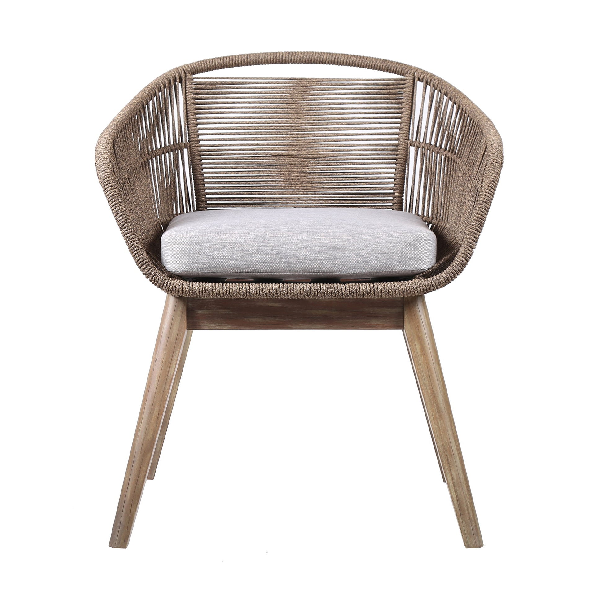 The Tutti Frutti Dark Eucalyptus and Latte Rope Indoor Outdoor Dining Chair from Armen Living is the quintessential choice of an outdoor dining chair that will give your living area a whole new aesthetic and presentation for you to enjoy. Featuring a eucalyptus wood base, the Tutti Frutti is durable and highly weather-resistant giving you years of extra enjoyment thanks to the longevity of these chairs. The incredibly comfortable seat cushion is meant to keep relaxed and alleviate any discomfort. This chair is designed with a unique feature where the frame is wrapped with highly durable and an immensely intricate woven rope - adding a completely new dimension to your outdoor furniture which will last just as long and will be even more eye-catching than conventional outdoor frame material. Pair with wood surfaces for an eclectic boho feel, or with concrete surfaces for a modern retreat. Its sturdy eucalyptus base is paired with an intricate marine-grade Regatta cord seat and topped with a soft cushion for a lesson in style and comfort. The rounded back gives ample support for lounging on beautiful patios and lush gardens.