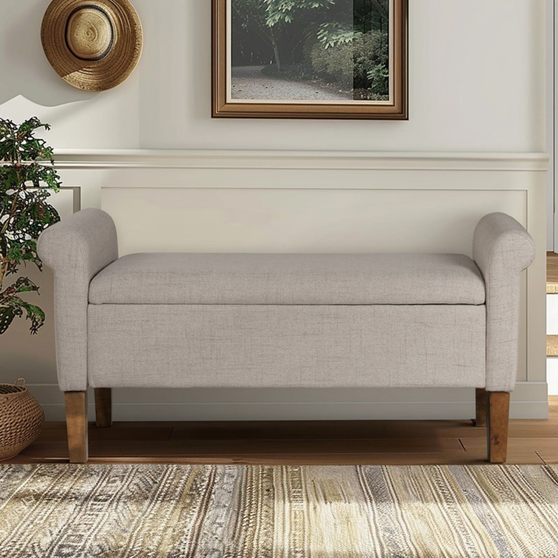 Upholstered Storage Bench With Rolled Armrests - Beige