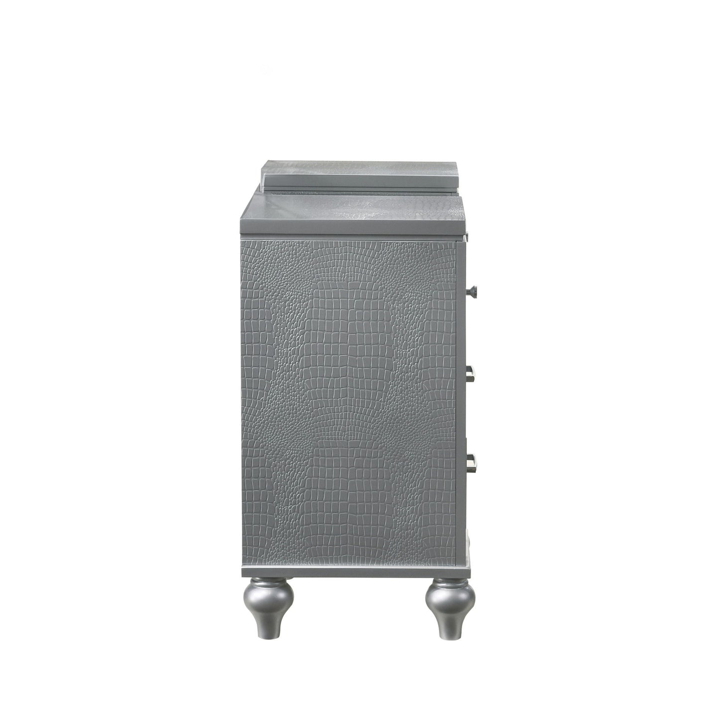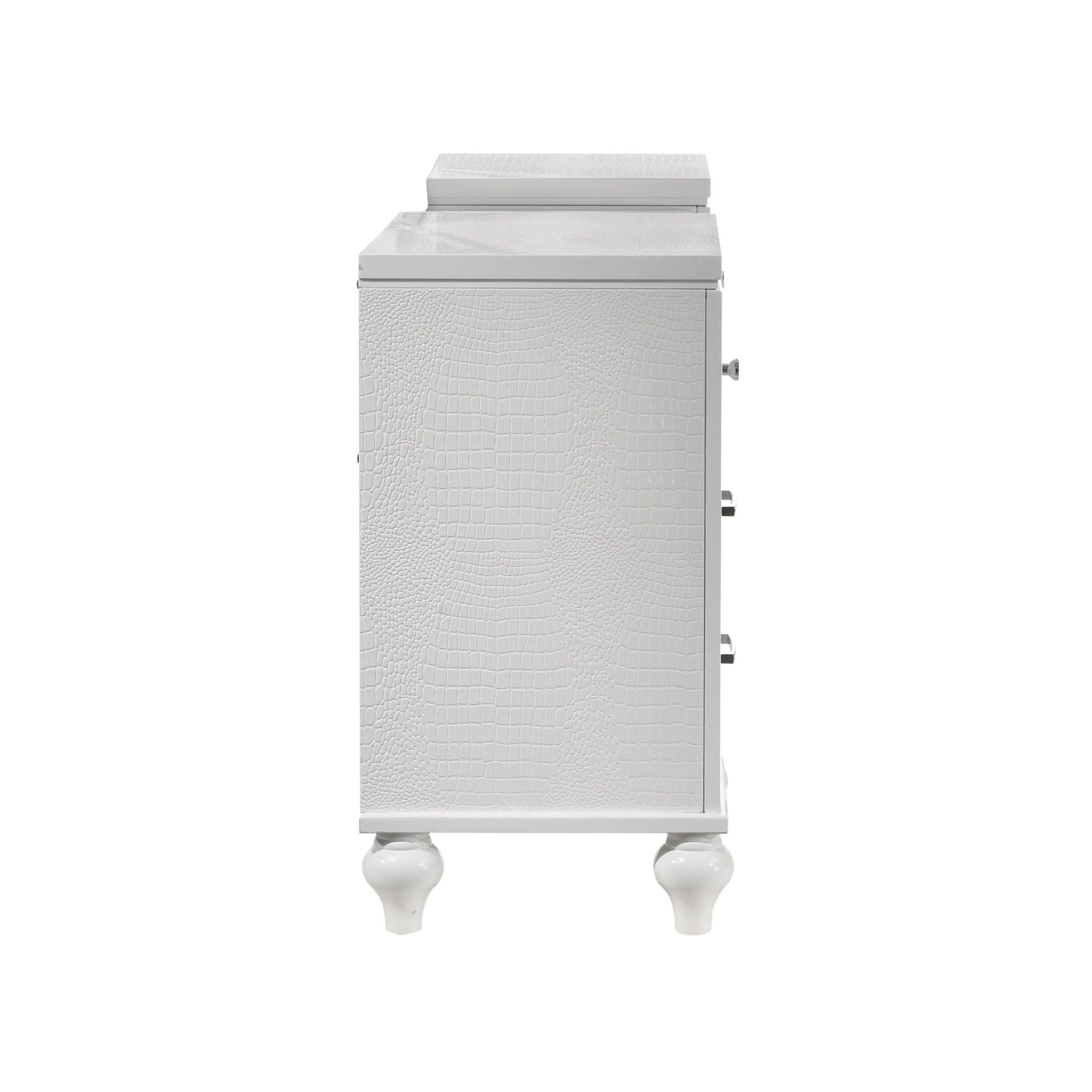 Introducing the Valentino 7 Drawer Vanity Dressing Table—a masterpiece of enduring craftsmanship crafted from a blend of manufactured and solid woods, adorned with exquisite embossed inlays. Revel in its glitz and glam, featuring a gleaming finish, mirrored trims, crystal-studded drawer pulls, and alligator-embossed accents that exude Hollywood allure. Delight in its thoughtful details, from heirloom-crafted English dovetailed drawers with snag-free interiors to smooth full-extension ball-bearing glides. With an abundance of storage, this vanity table offers ample space to organize cosmetics and accessories, including a luxurious velvet-lined drawer for jewelry. Transform your beauty routine into a glamorous experience with this exquisite piece—a true reflection of style and functionality.