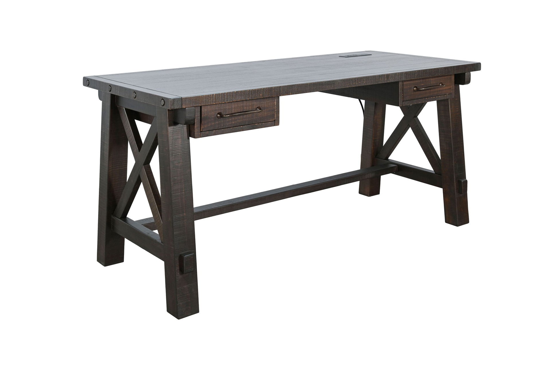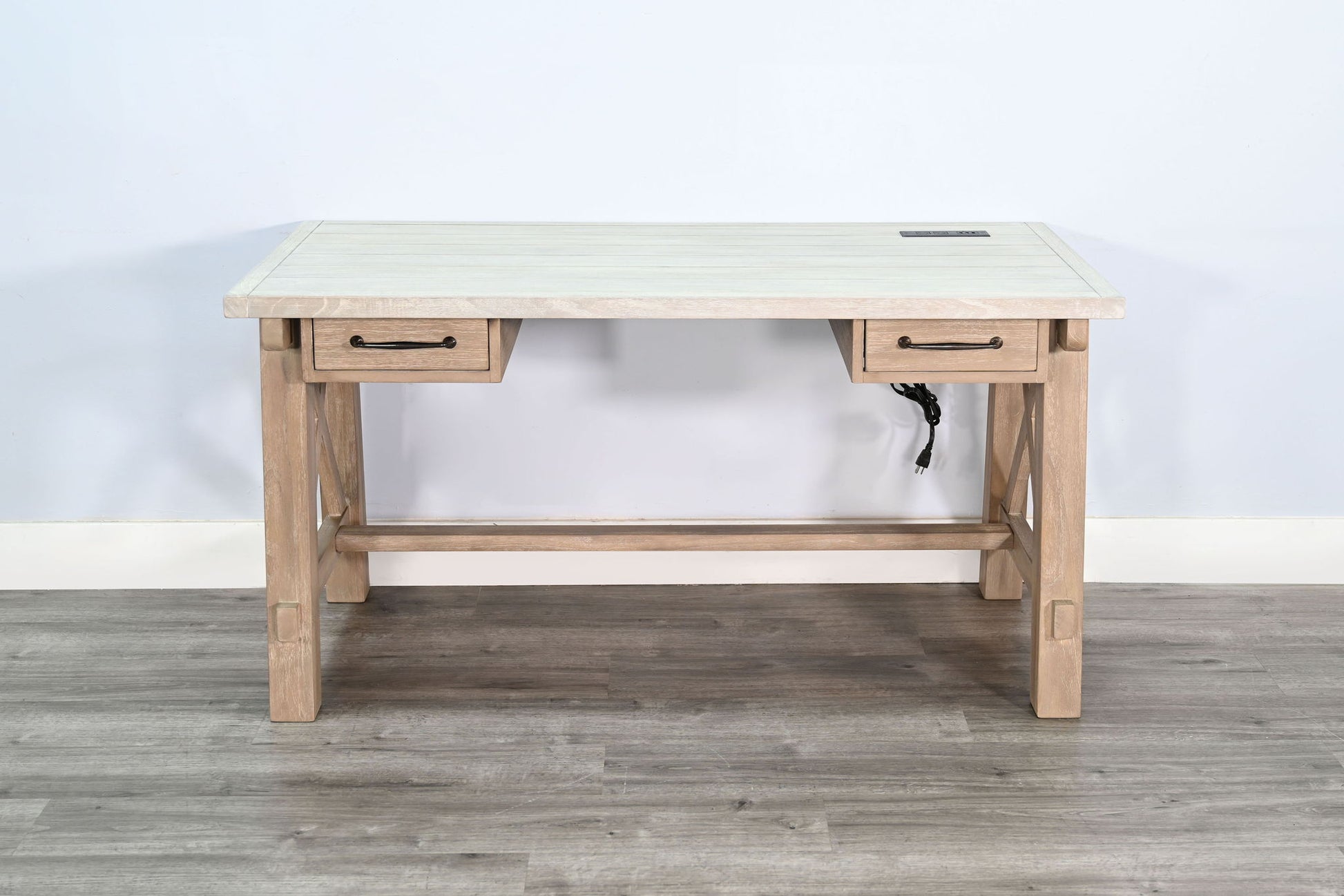 Bring functionality and style to your workspace with this Rustic Writing Desk. Featuring a beautiful finish, this desk combines classic farmhouse charm with modern conveniences. The spacious desktop offers ample space for your work essentials, while the built-in USC and power outlets provide easy connectivity. Two side drawers with metal handles and an open design with X-frame legs add to its rustic elegance and practicality, making it an ideal addition to any home office or study.