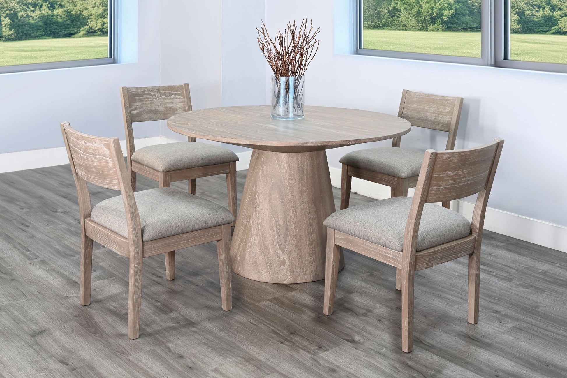 This elegant round dining set features a modern and minimalist design, highlighted by its wheat-colored finish. The tabletop is smooth and spacious, offering ample room for dining and entertaining. It rests on a sturdy, conical pedestal base that provides both stability and a sleek aesthetic. The natural wood grain texture adds a touch of rustic charm while maintaining a contemporary appeal, making it a versatile piece that can complement various interior styles.
